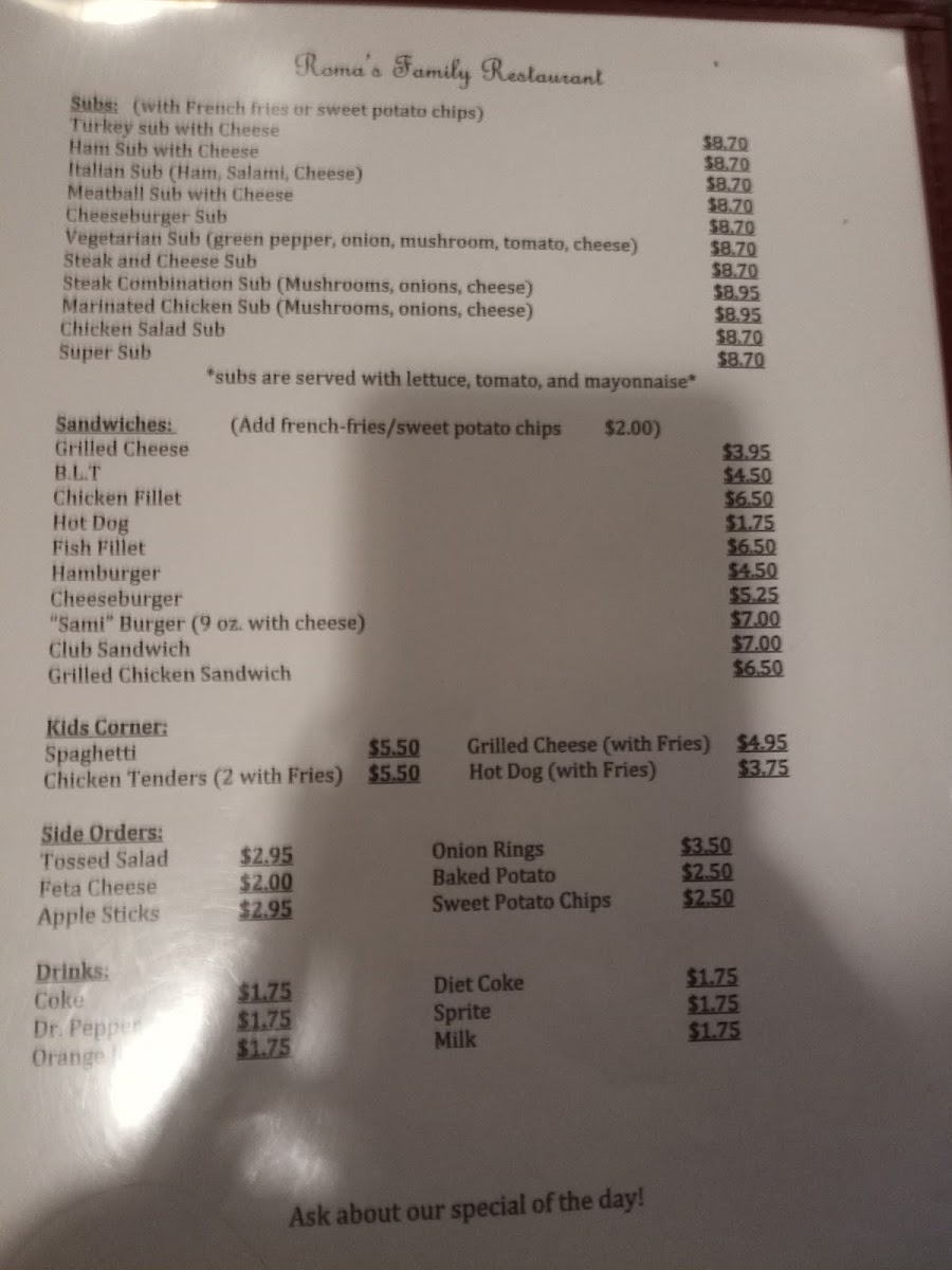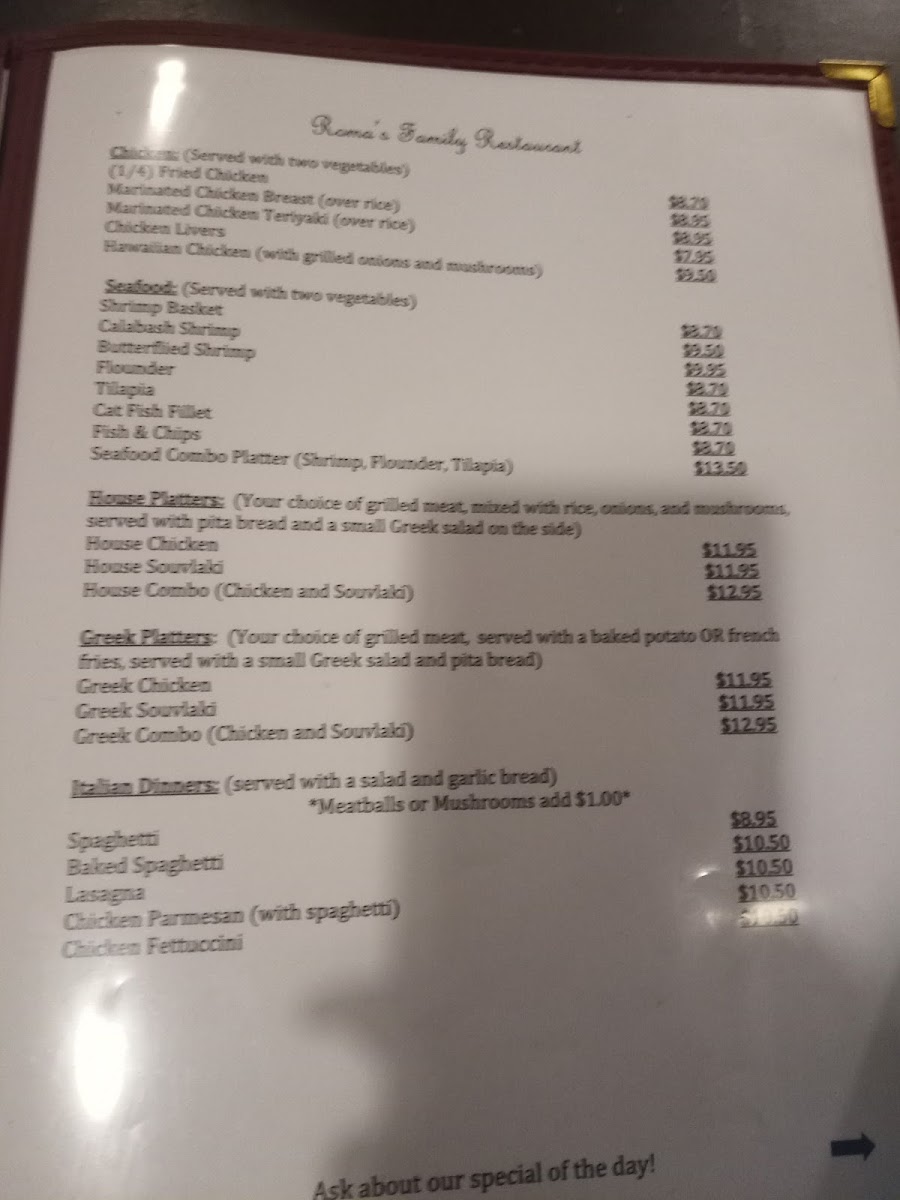 Roma's Family Restaurant offers a straightforward and comforting menu that suits a relaxed family dining experience. The menu combines classic Southern favorites with hearty Italian dishes and a touch of Greek flavors, making it a versatile choice throughout the day. Whether you’re stopping by for a fulfilling breakfast, a casual lunch, or a cozy dinner, the selection feels firmly rooted in home-cooked tradition.