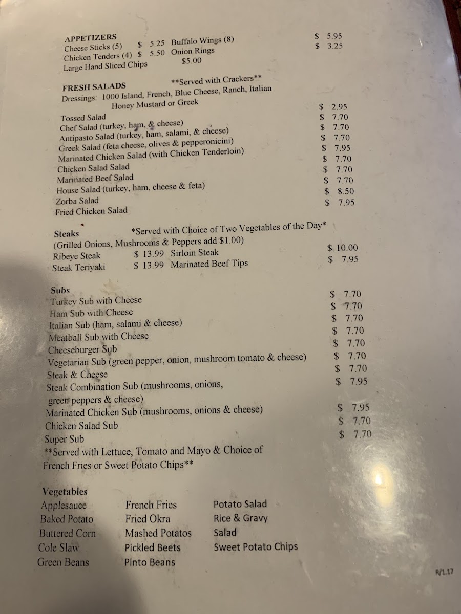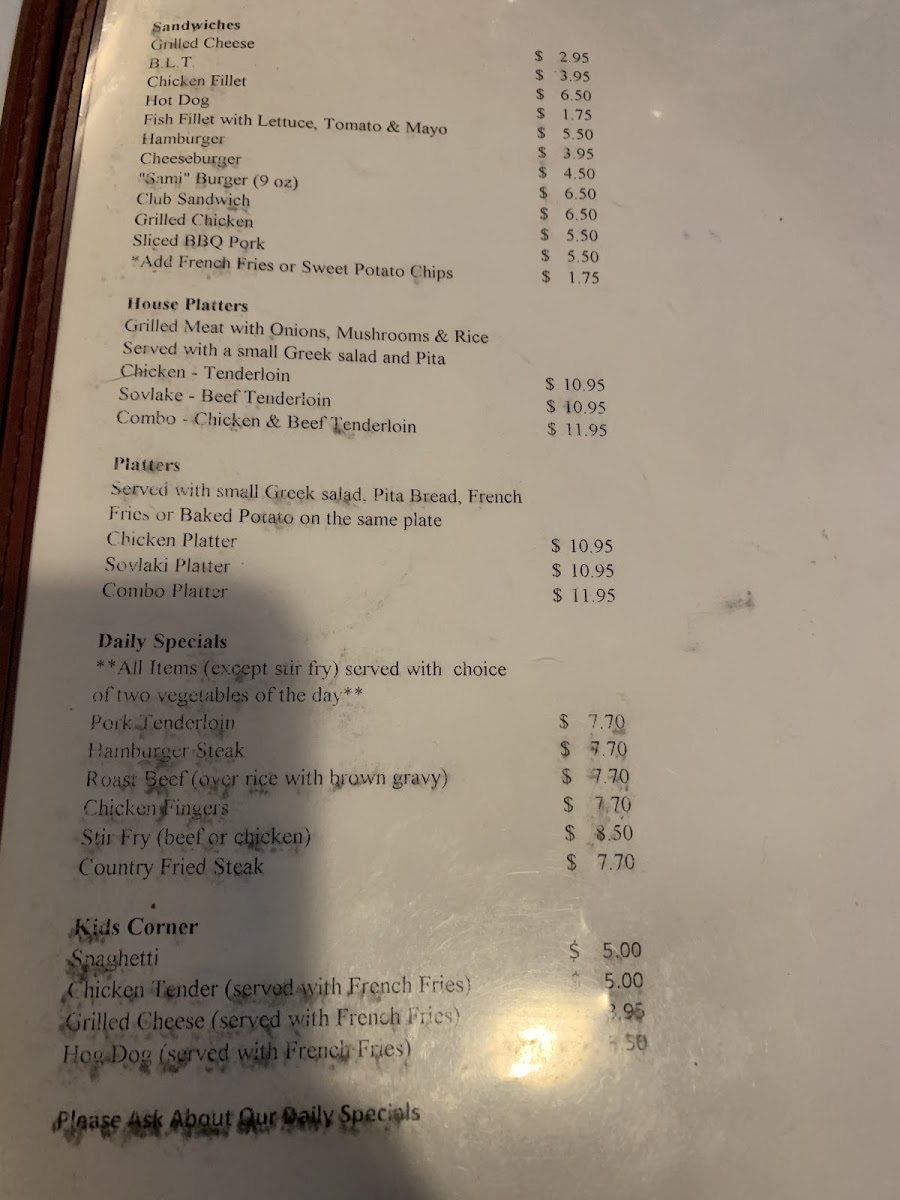 Guests will find satisfying options like chicken and beef combination plates or a Country Fried Steak served with two sides, perfect for those looking for a wholesome and familiar meal. For a lighter yet flavorful choice, Greek platters such as Chicken Souvlaki provide a gentle Mediterranean touch that fits well with the modest and welcoming atmosphere of the restaurant.
